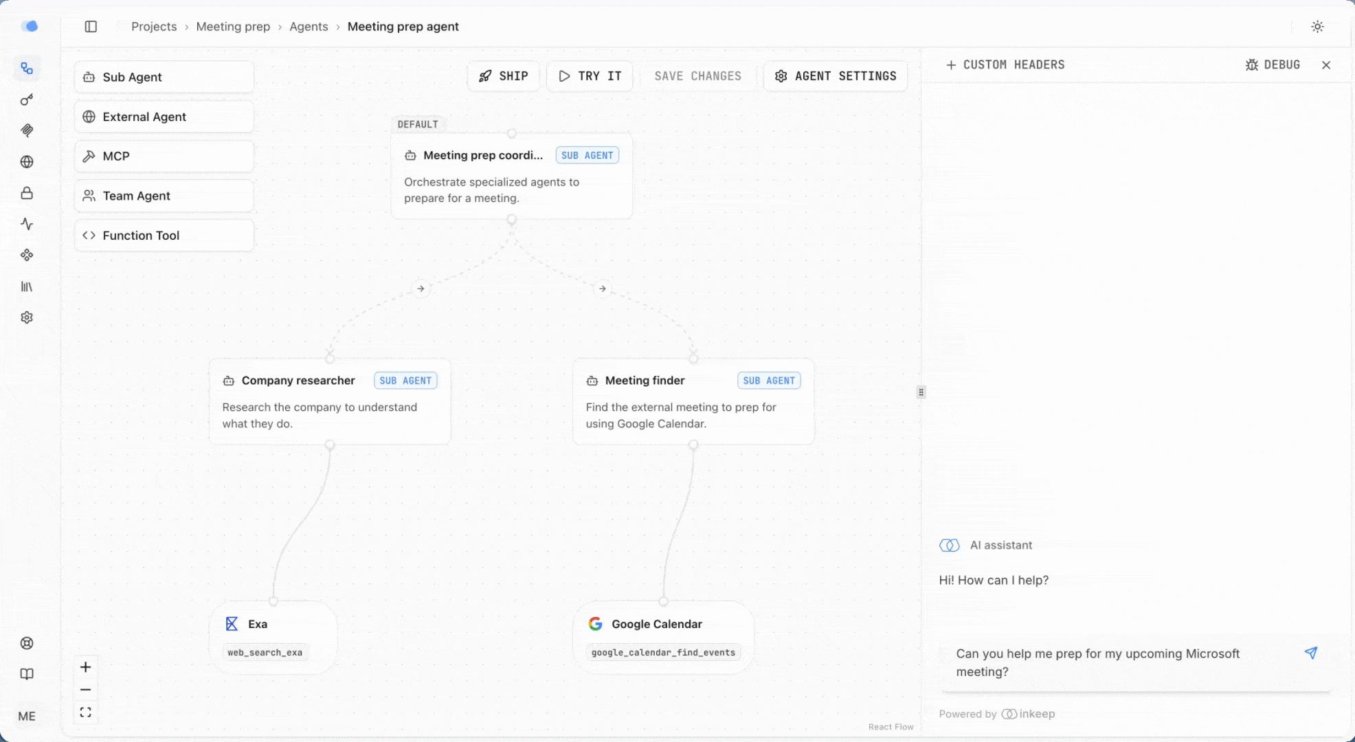 In this tutorial, you'll build a meeting prep assistant agent using the Inkeep Visual Builder. When you ask "Can you help me prep for my upcoming Acme meeting?", the agent will: